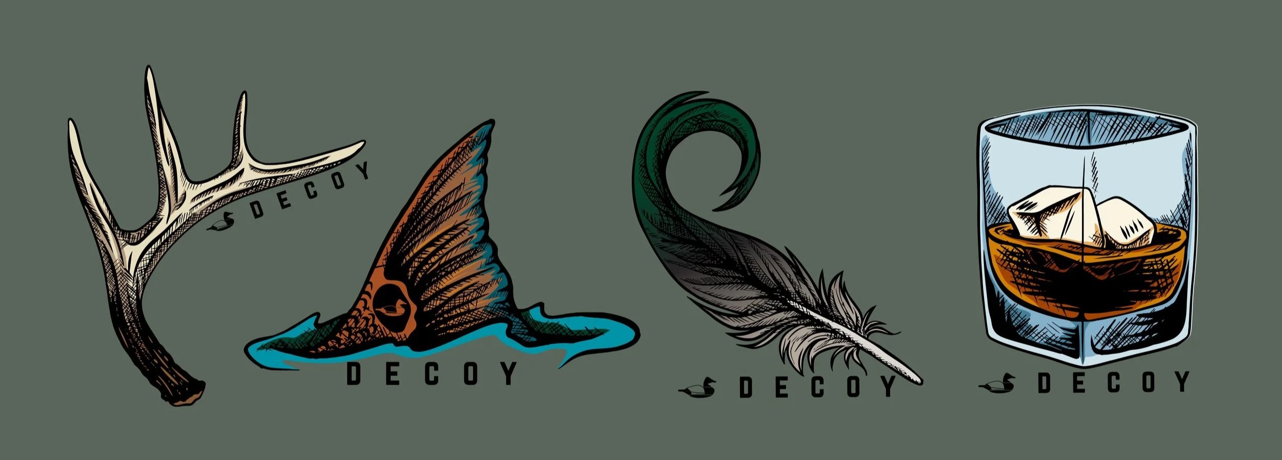 For Decoy Apparel Co., a lifestyle brand based in New Bern, North Carolina, I created a hand-drawn custom icon system representing the four pillars of the brand: woods, wings, water, and whisky. Rooted in Decoy’s mission to restore the soul of the Southeast’s rich waterfowling tradition, the icons draw from heritage, craftsmanship, and the memories made in the duck blind. Each pillar was developed in three distinct styles: a hatched, shaded icon with a hand-drawn, illustrative feel; a simplified solid icon for versatility and scalability; and a colorized version designed specifically for decals and merchandise. Together, these variations allow the icon system to adapt seamlessly across apparel, branding, and physical products while maintaining a cohesive visual identity.
